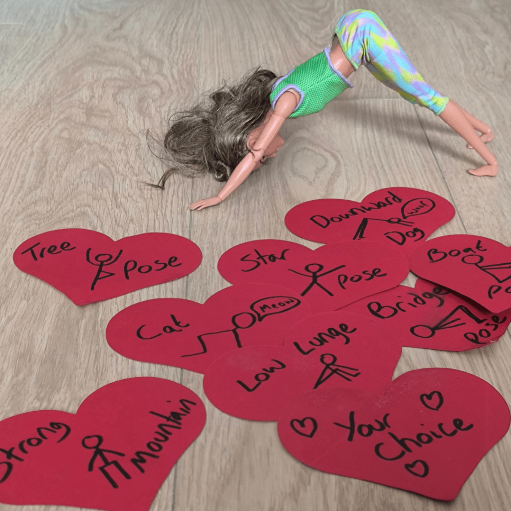 On each heart, write and draw a yoga pose. This is something older children will be able to help with too.