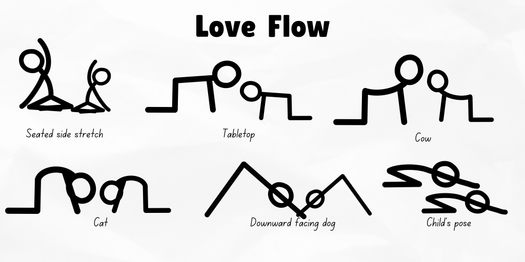 Throughout this sequence, focus on breathing deeply and maintaining a sense of playfulness. Use gentle cues and encouragement to guide your child through the poses. No need to correct them, as long as they are practicing safely, let them find their own expressions of the pose as you model this flow. It will help to practice this sequence regularly together so that they can get used to it. The repetition and familiarity will help children to focus on the breath as they move as they’ll know what is coming next. Not only will this help with feeling connected with each other, it can also be soothing for the nervous system.